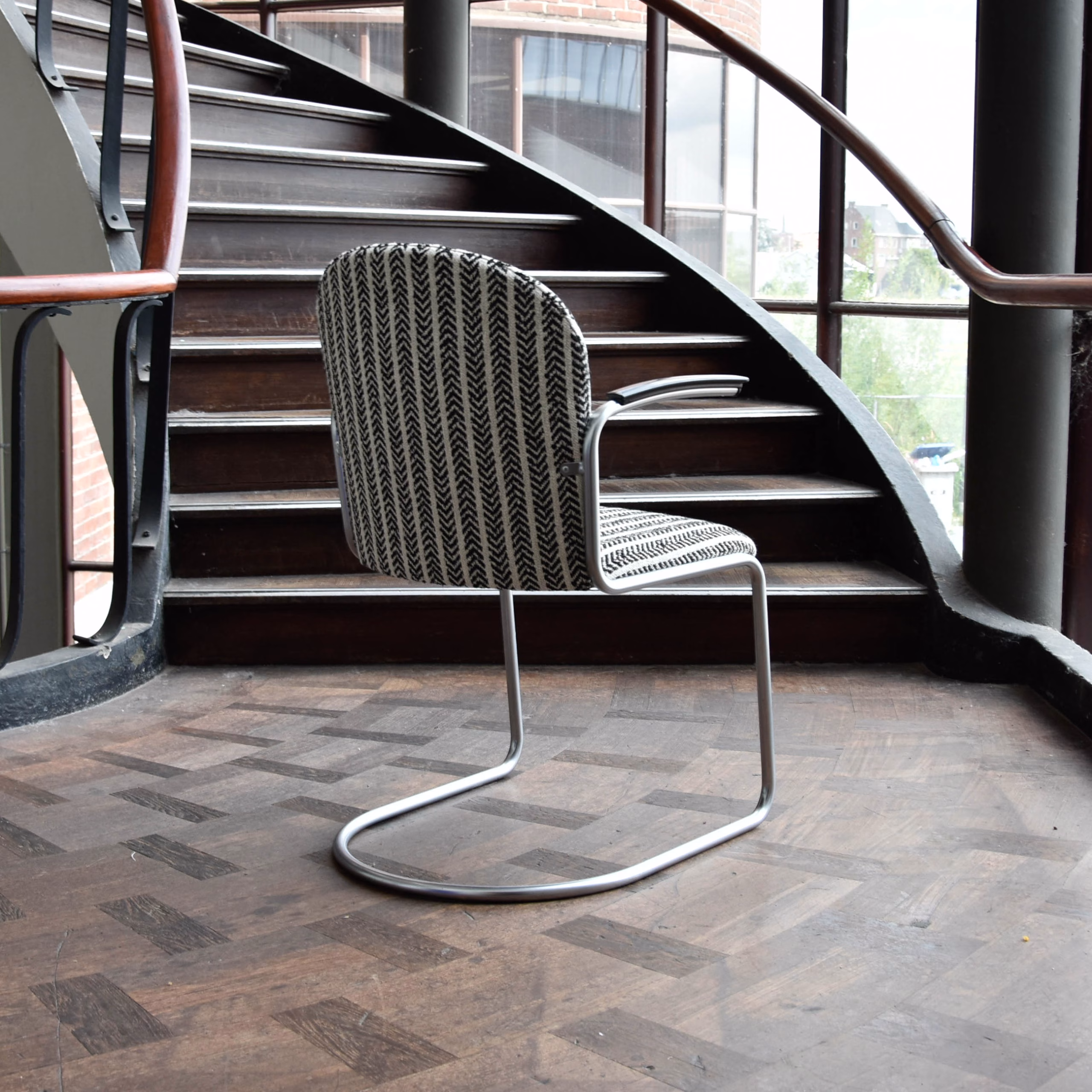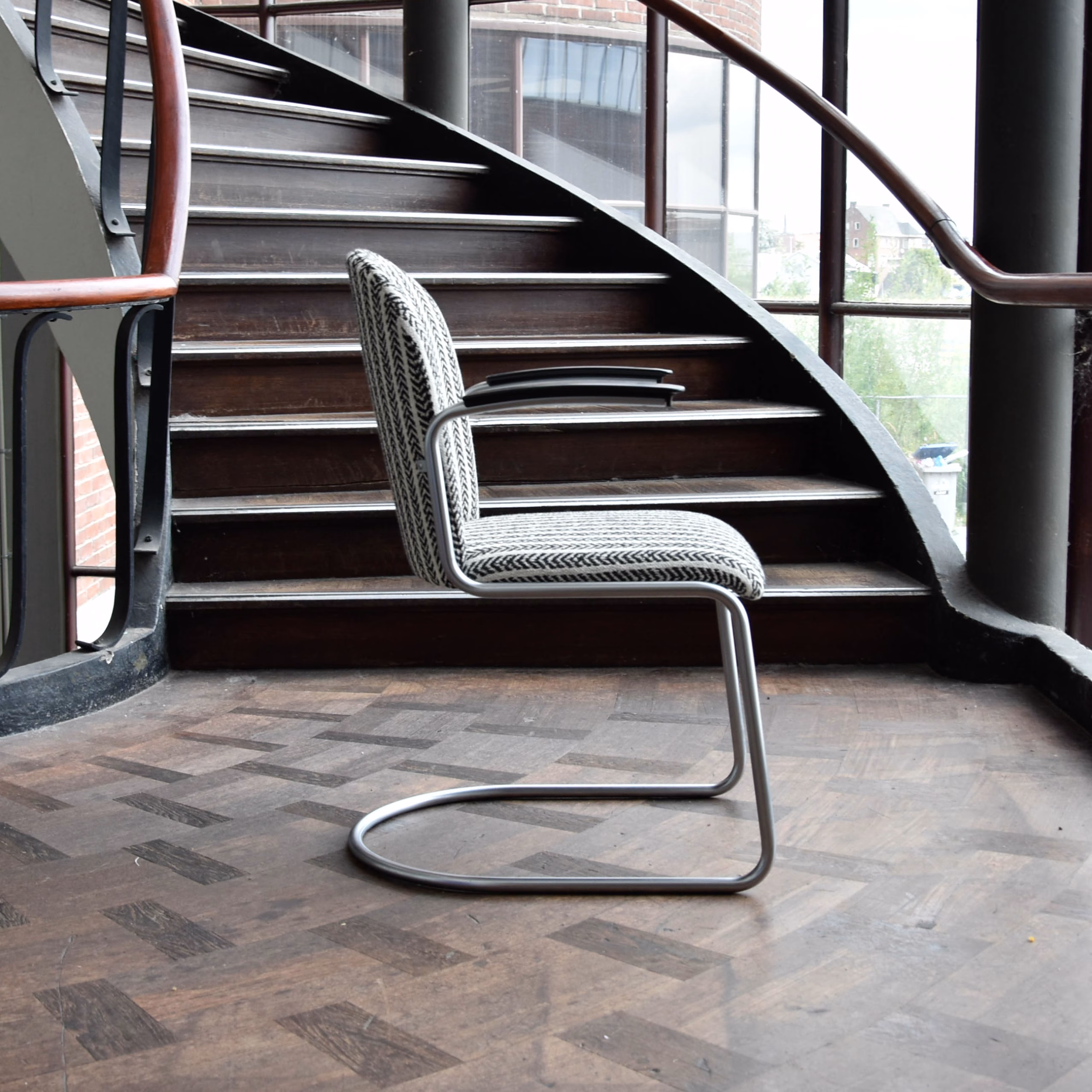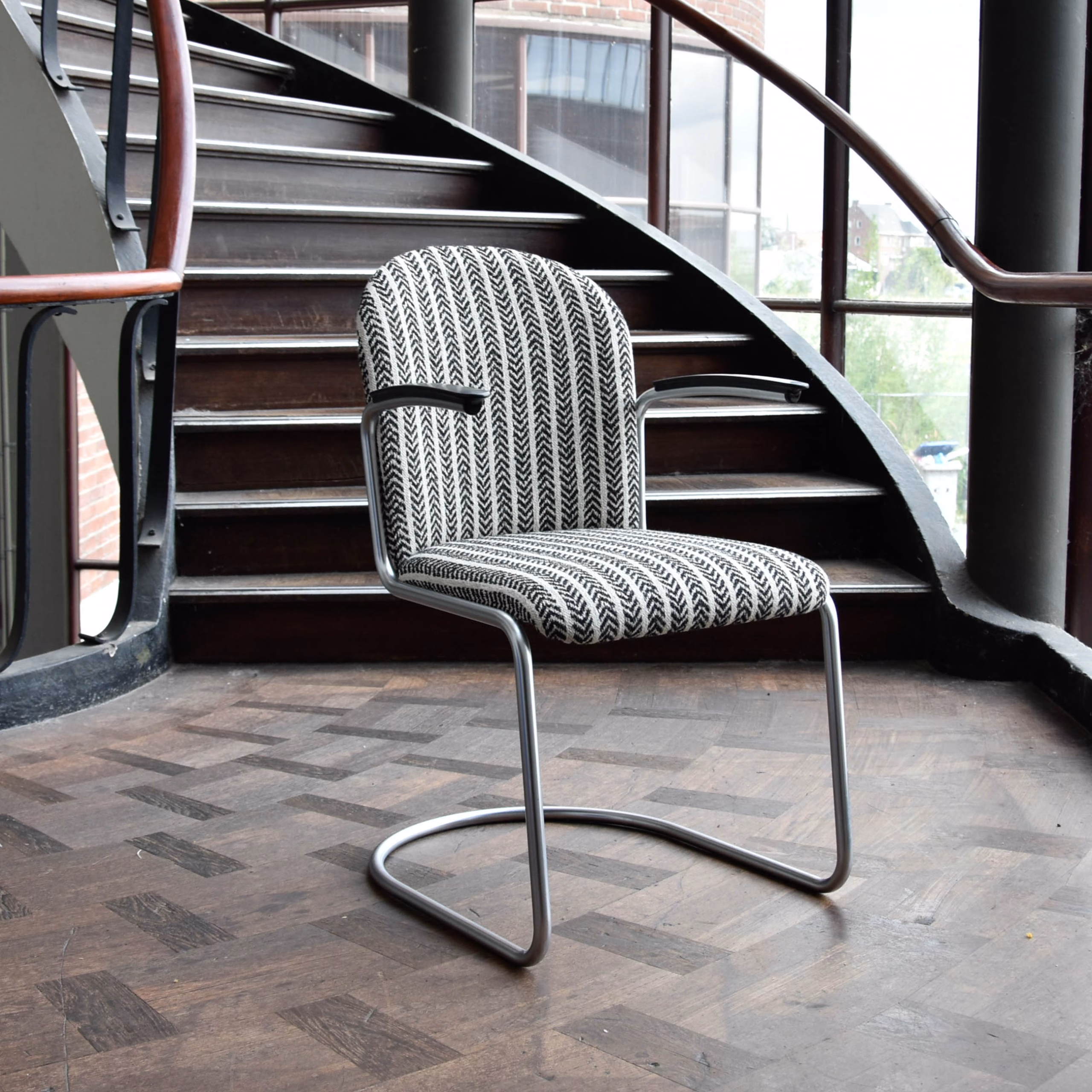 De Gispen Stoel 413 R, ontworpen door W.H. Gispen, is een iconisch stuk dat staat voor elegantie en functionaliteit. Deze stoel heeft een verend, achterpootloos ontwerp dat bekend staat als het “Rechtop” model.