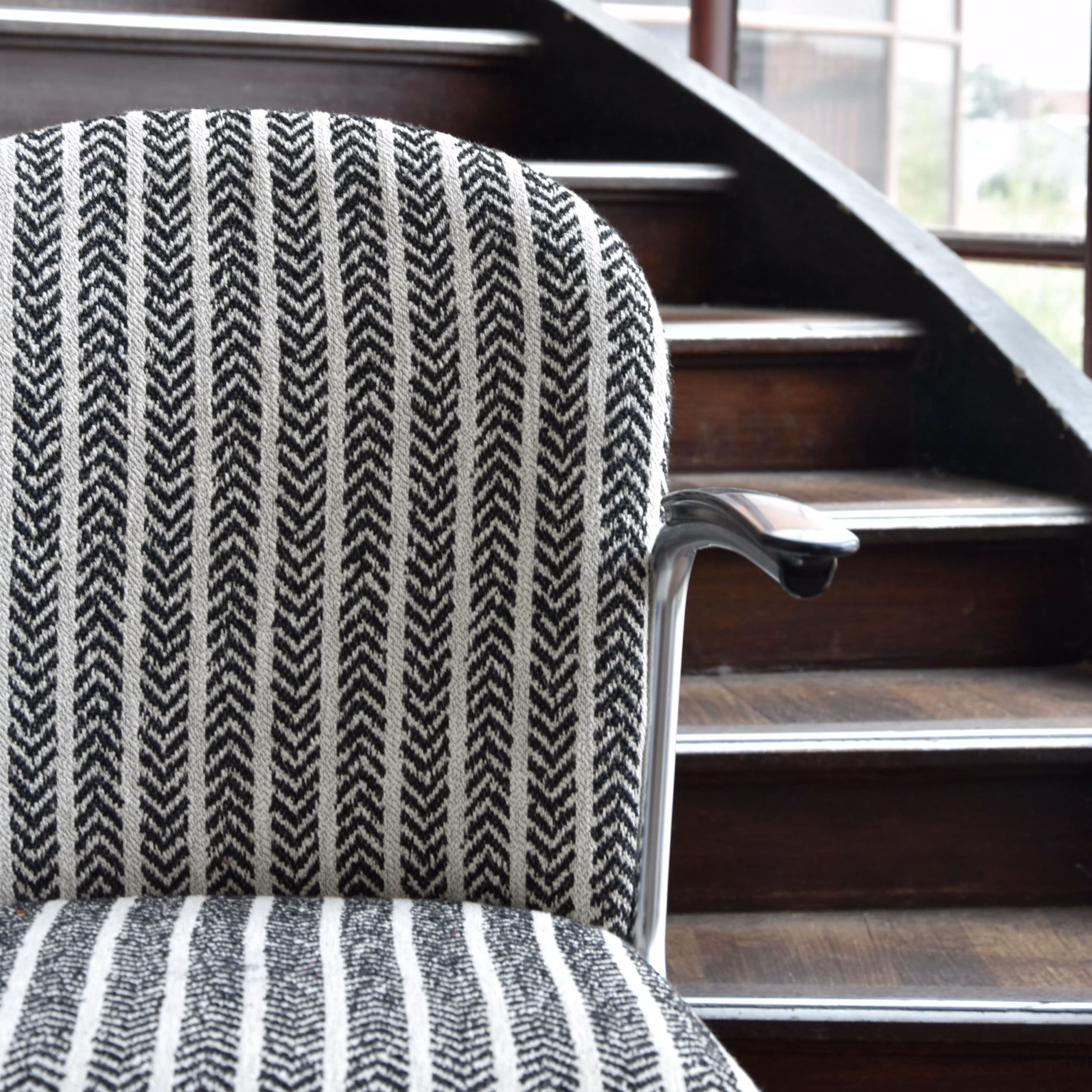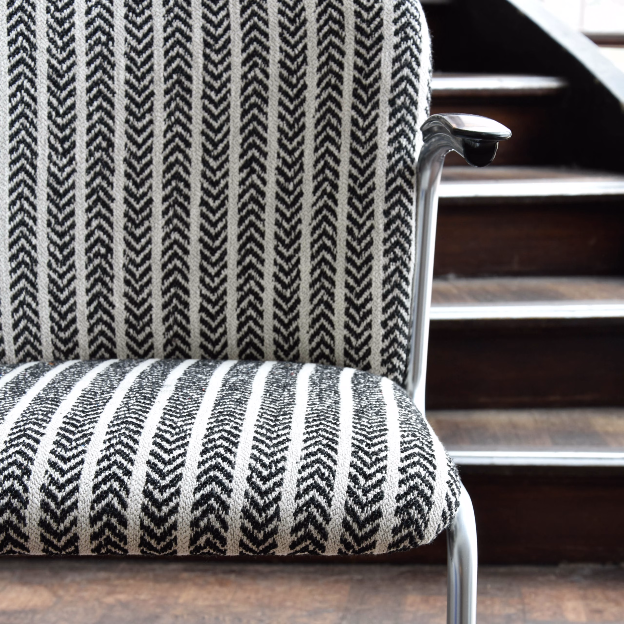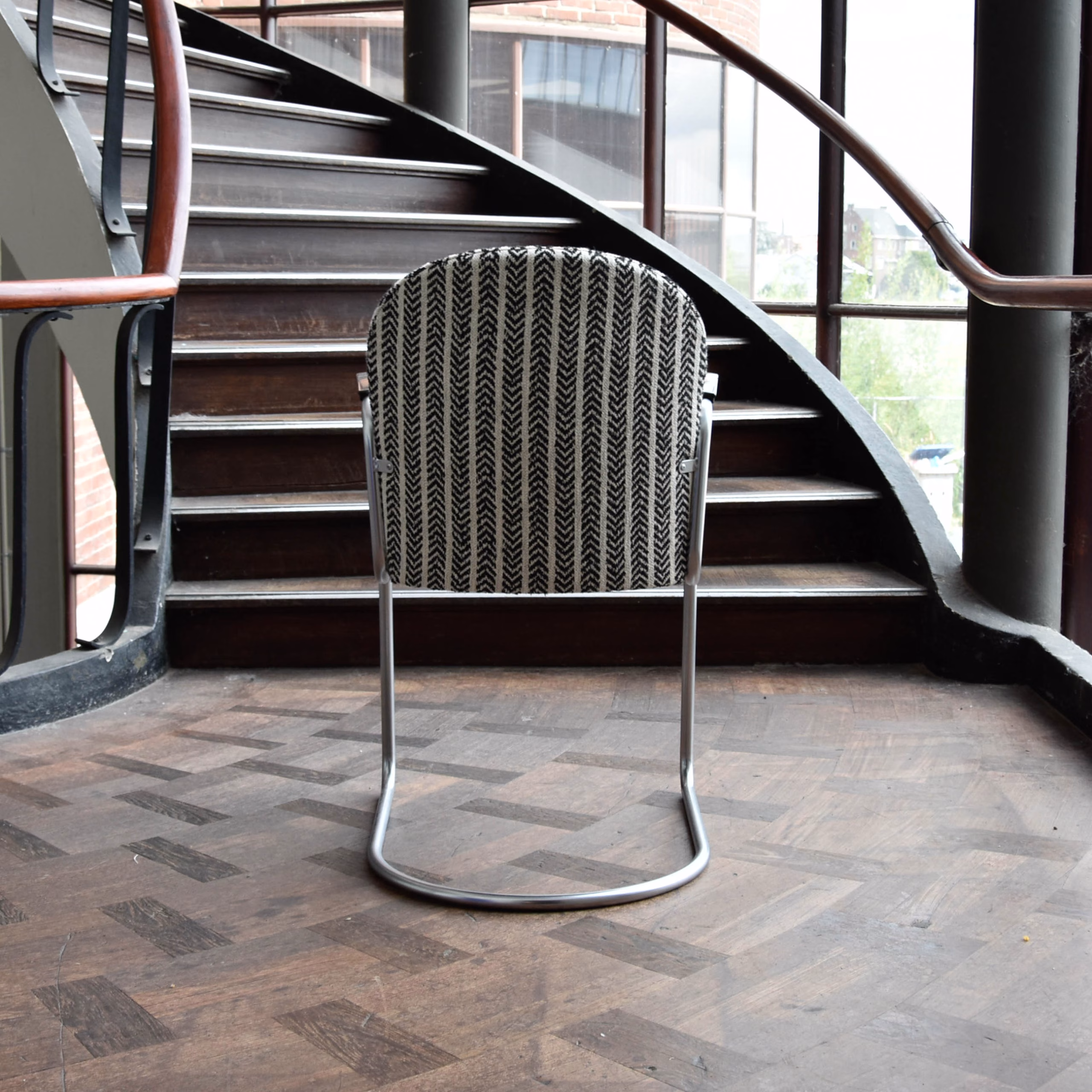 De Gispen Stoel 413 R, ontworpen door W.H. Gispen, is een iconisch stuk dat staat voor elegantie en functionaliteit. Deze stoel heeft een verend, achterpootloos ontwerp dat bekend staat als het “Rechtop” model.